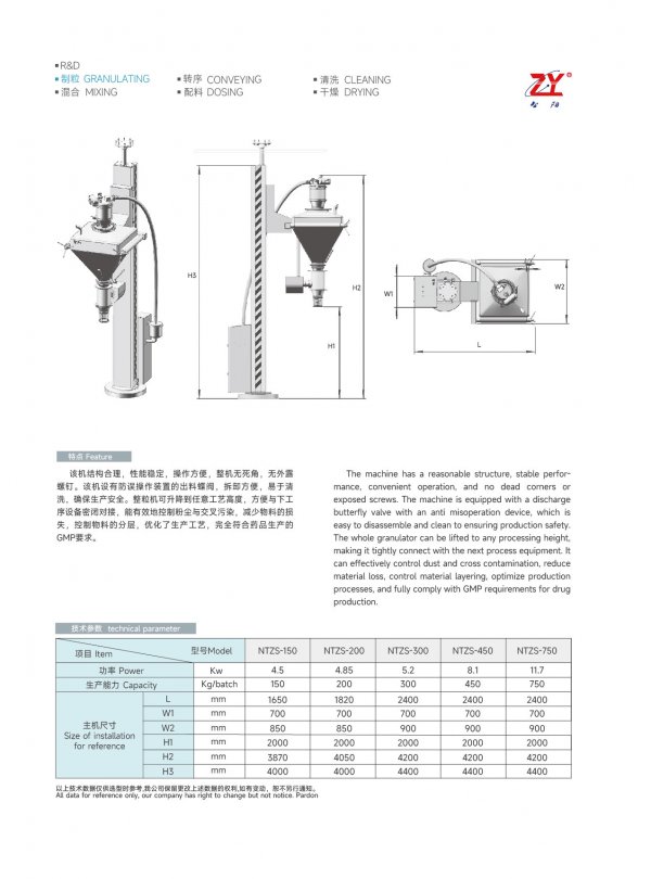 The machine mainly consists of a chassis, support frame, lifting system, vacuum feeding system, buffer hopper, and milling system. Start the vacuum feeding during operation. and through vacuum, the granules are sucked from the fluid bed material trolley into the chamber of the milling. In the chamber,after the granules get through striking、extruding and cutting process,then discharged by sieve of milling go to sieving or next process.