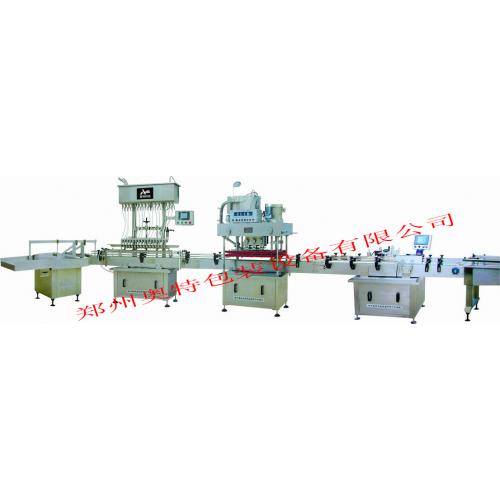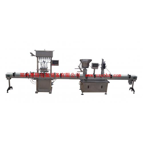 灌装旋盖线特点:灌装系统设定缩水功能,无滴漏。适用各种粘度液体灌装。灌装针头潜入瓶底灌装、缓慢上升,防止起泡。灌装、旋盖一体,经济实用占地小。磁力矩旋盖头,松、紧任意调节。整机按GMP要求设计。
