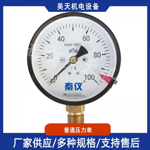 普通压力表适用测量无爆炸,不结晶,不凝固,对铜和铜合金无腐蚀作用的液体、气体的压力。外壳材料有铁壳和不锈钢壳二种,型号规格有Y-50/Y60/Y100/Y150。压力表通过表内的敏感元件(波登管、膜盒、波纹管)的弹性形变,再由表内机芯的转换机构将压力形变传导至指针,引起指针转动来指示压力。