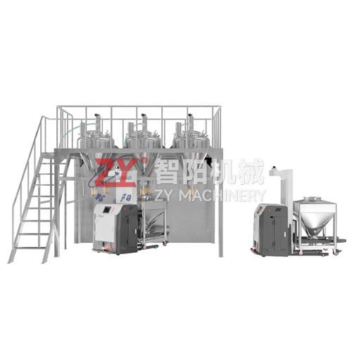按照生产指令和配方,将多种物料分别投入无尘投料站,真空输送器将物料输送到高位暂存料仓,螺旋喂料器将物料定量加入至AGV移动小车上面的称量料仓,在加料过程、重量、精度符合配方要求,投量、输送、计量过程中无粉尘泄漏。